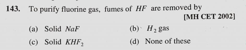 To purify fluorine gas, fumes of HF are removed by (a) Solid NaF (b) H2 gas (c) Solid KHF2 (d) None of these fumes of HF are removed by (a) Solid NaF (b) H2 gas (c) Solid KHF2 (d) None of these To purify fluorine gas November 25, 2020 Category: Uncategorised (JEE Advanced Physics by BM Sharma + GMP Solutions) , Facebook Messenger WhatsApp Share this:TwitterFacebook Related