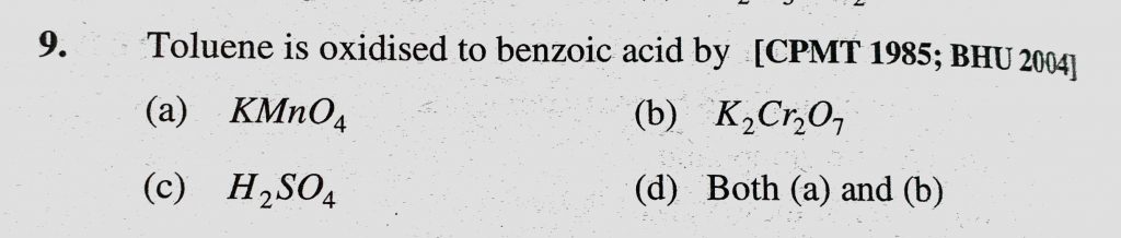 Toluene is oxidised to benzoic acid by (a) KMnO4 (b) K2Cr2O7 (c) H2SO4 (d) Both (a) and (b) Toluene is oxidised to benzoic acid by (a) KMnO4 (b) K2Cr2O7 (c) H2SO4 (d) Both (a) and (b) February 12, 2021 Category: Uncategorised (JEE Advanced Physics by BM Sharma + GMP Solutions) , Facebook Messenger WhatsApp Share this:TwitterFacebook Related