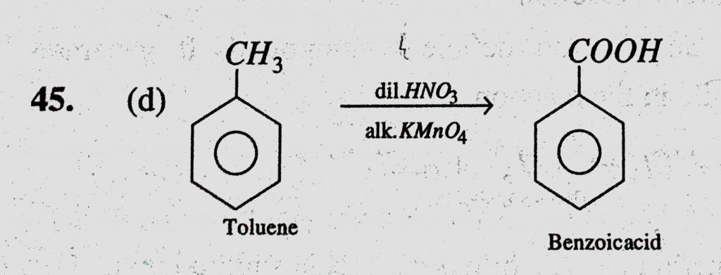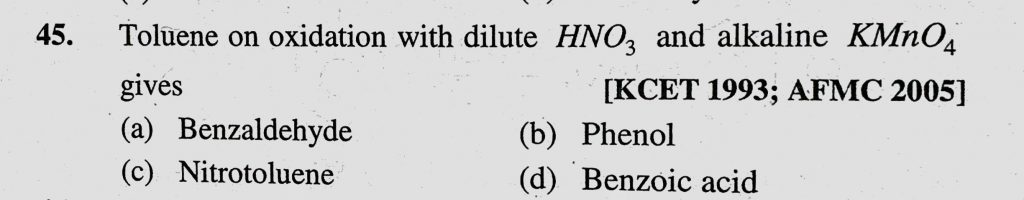 Toluene on oxidation with dilute HNO3 and alkaline KMnO4 gives (a) Benzaldehyde (b) Phenol (c) Nitrotoluene (d) Benzoic acid Toluene on oxidation with dilute HNO3 and alkaline KMnO4 gives (a) Benzaldehyde (b) Phenol (c) Nitrotoluene (d) Benzoic acid December 15, 2020 Category: Uncategorised (JEE Advanced Physics by BM Sharma + GMP Solutions) , Facebook Messenger WhatsApp Share this:TwitterFacebook Related