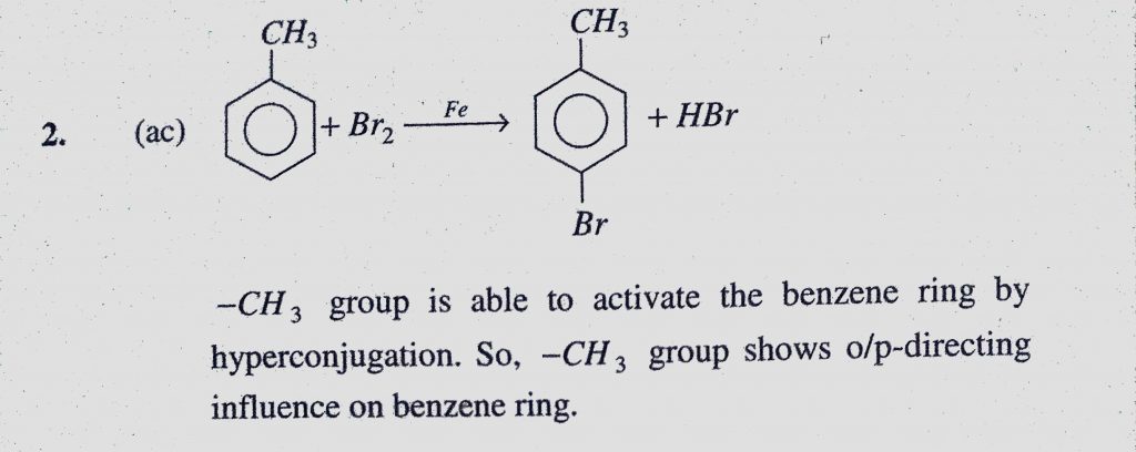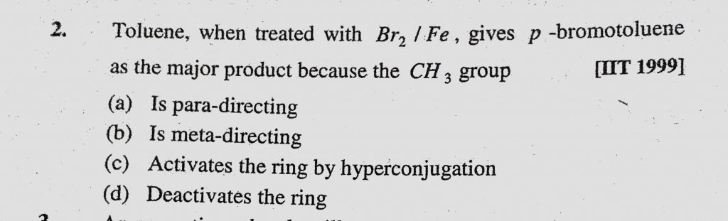 Toluene, when treated with Br2/Fe, gives p-bromotoluene as the major product because the CH3 group (a) Is para-directing (b) Is meta-directing (c) Activates the ring by hypreconjugation gives p-bromotoluene as the major product because the CH3 group (a) Is para-directing (b) Is meta-directing (c) Activates the ring by hypreconjugation Toluene when treated with Br2/Fe December 16, 2020 Category: Uncategorised (JEE Advanced Physics by BM Sharma + GMP Solutions) , Facebook Messenger WhatsApp Share this:TwitterFacebook Related