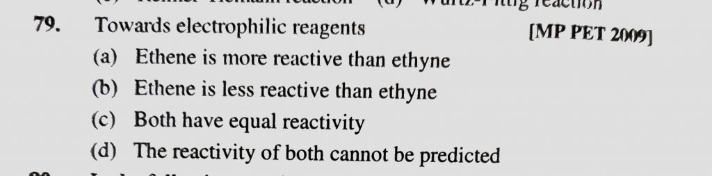 Towards electrophilic reagents (a) Ethene is more reactive than ethyne (b) Ethene is less reactive than ethyne (c) Both have equal reactivity Towards electrophilic reagents (a) Ethene is more reactive than ethyne (b) Ethene is less reactive than ethyne (c) Both have equal reactivity December 13, 2020 Category: Uncategorised (JEE Advanced Physics by BM Sharma + GMP Solutions) , Facebook Messenger WhatsApp Share this:TwitterFacebook Related