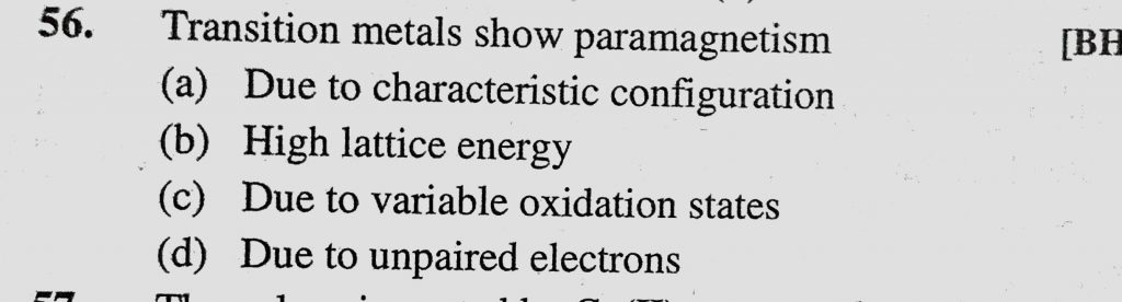 Transition metals show paramagnetism (a) Due to characteristic configuration (b) High lattice energy Transition metals show paramagnetism (a) Due to characteristic configuration (b) High lattice energy November 29, 2020 Category: Uncategorised (JEE Advanced Physics by BM Sharma + GMP Solutions) , Facebook Messenger WhatsApp Share this:TwitterFacebook Related