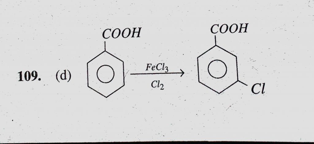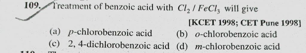 Treatment of benzoic acid with Cl2 / FeCl3 will give (a) p-chlorobenzoic acid (b) o-chlorobenzoic acid (c) 2, 4-dichlorobenzoic acid (d) m-chlorobenzoic acid 4-dichlorobenzoic acid (d) m-chlorobenzoic acid Treatment of benzoic acid with Cl2 / FeCl3 will give (a) p-chlorobenzoic acid (b) o-chlorobenzoic acid (c) 2 February 13, 2021 Category: Uncategorised (JEE Advanced Physics by BM Sharma + GMP Solutions) , Facebook Messenger WhatsApp Share this:TwitterFacebook Related