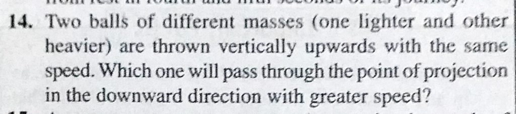 Two balls of different masses (one lighter and other heavier) are thrown vertically upwards with the same speed. Which one will pass through the point of projection in the downward direction Two balls of different masses (one lighter and other heavier) are thrown vertically upwards with the same speed. Which one will pass through the point of projection in the downward direction September 18, 2020 Category: Uncategorised (JEE Advanced Physics by BM Sharma + GMP Solutions) , Facebook Messenger WhatsApp Share this:TwitterFacebook Related