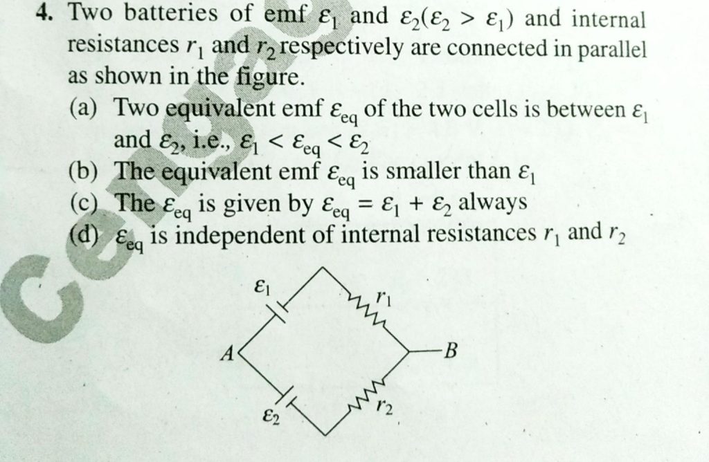 Two batteries of emf e1 and e2 ( e2 > e1 ) and internal resistance r1 and r2 respectively are connected in parallel as shown in the figure. Two batteries of emf e1 and e2 ( e2 > e1 ) and internal resistance r1 and r2 respectively are connected in parallel as shown in the figure. September 19, 2020 Category: Uncategorised (JEE Advanced Physics by BM Sharma + GMP Solutions) , Facebook Messenger WhatsApp Share this:TwitterFacebook Related