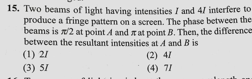 Two beams of light having intensities I and 4 I interfere to produce a fringe pattern on a screen. The phase between the beams is pie/2 at point A and pie at point B. Then, the difference the difference Two beams of light having intensities I and 4 I interfere to produce a fringe pattern on a screen. The phase between the beams is pie/2 at point A and pie at point B. Then October 10, 2020 Category: Uncategorised (JEE Advanced Physics by BM Sharma + GMP Solutions) , Facebook Messenger WhatsApp Share this:TwitterFacebook Related