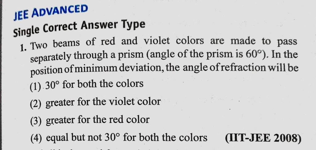 Two beams of red and violet colors are made to pass separately through a prism ( angle of the prism is 60). In the position of minimum deviation, the angle of refraction will be the angle of refraction will be Two beams of red and violet colors are made to pass separately through a prism ( angle of the prism is 60). In the position of minimum deviation October 7, 2020 Category: Uncategorised (JEE Advanced Physics by BM Sharma + GMP Solutions) , Facebook Messenger WhatsApp Share this:TwitterFacebook Related