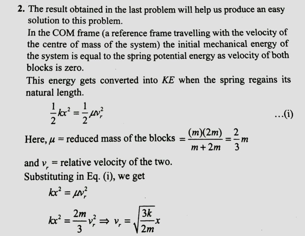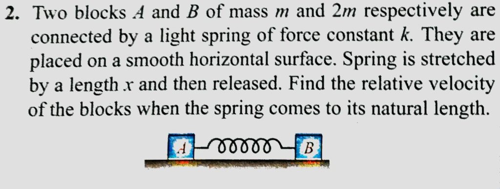Two blocks A and B of mass m and 2 m respectively are connected by a light spring of force constant K. They are placed on a smooth horizontal surface . spring is stretched by a length x and then released. Find the releative velocity of the blocks when the spring comes to its natural length.