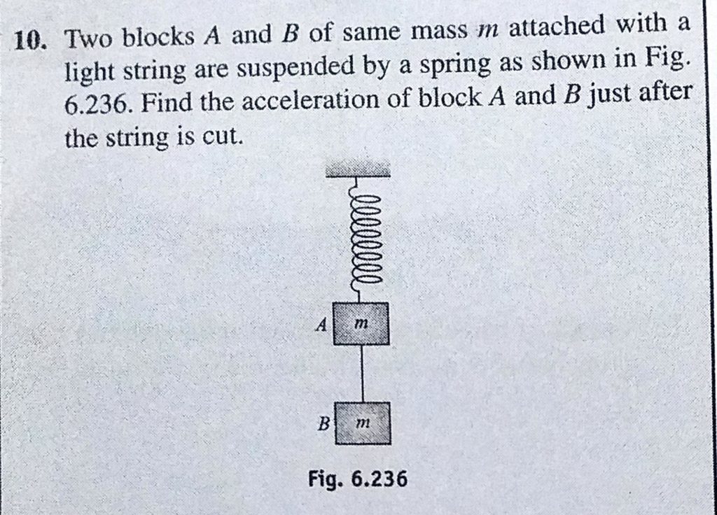 Two blocks A and B of same mass m attached with a light string are suspended by a spring as shown in Fig. 6.236. Find the acceleration of block A and B just after the string is cut. Two blocks A and B of same mass m attached with a light string are suspended by a spring as shown in Fig. 6.236. Find the acceleration of block A and B just after the string is cut. September 29, 2020 Category: Uncategorised (JEE Advanced Physics by BM Sharma + GMP Solutions) , Facebook Messenger WhatsApp Share this:TwitterFacebook Related