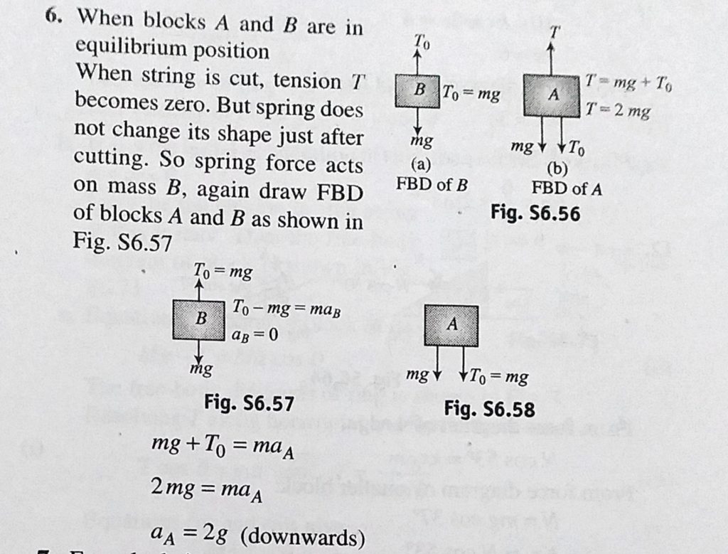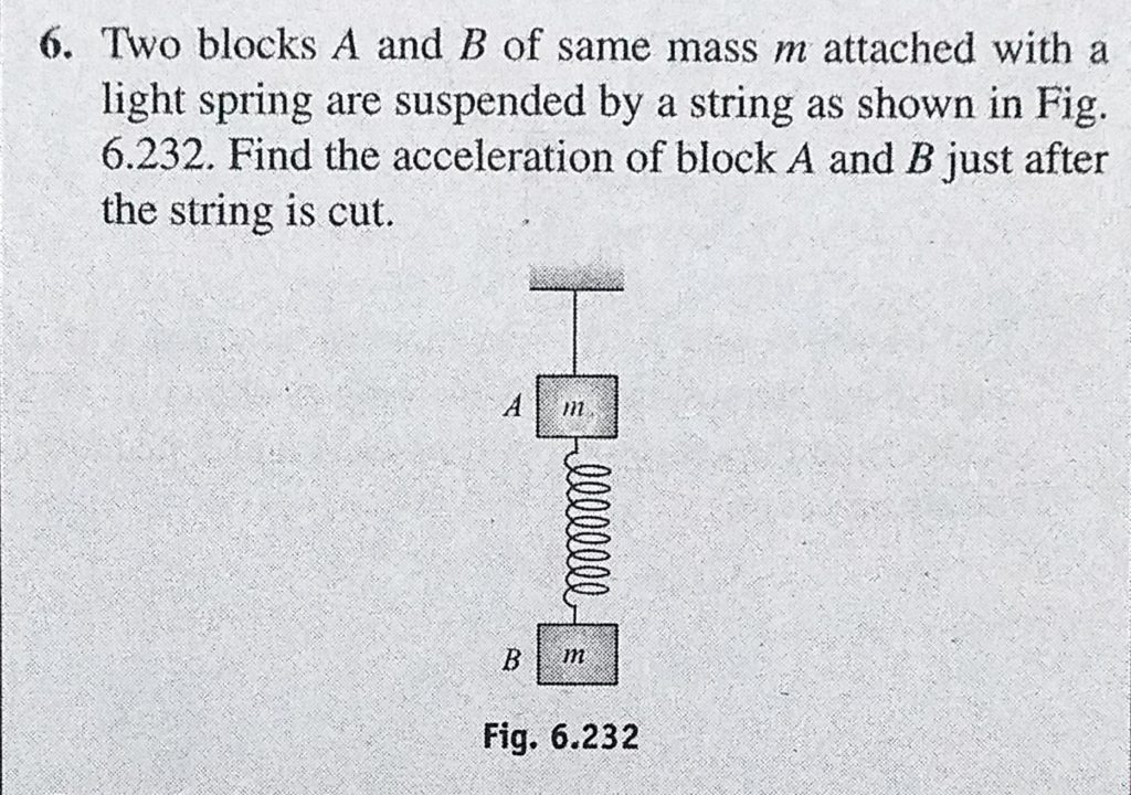 Two blocks A and B of same mass m attached with a light spring are suspended by a string as shown in Fig. 6.232. Find the acceleration of block A and B just after the string is cut. Two blocks A and B of same mass m attached with a light spring are suspended by a string as shown in Fig. 6.232. Find the acceleration of block A and B just after the string is cut. September 29, 2020 Category: Uncategorised (JEE Advanced Physics by BM Sharma + GMP Solutions) , Facebook Messenger WhatsApp Share this:TwitterFacebook Related