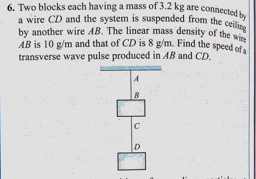 Two blocks each having a mass of 3.2 kg are connected by a wire CD and the system is suspended from the ceiling by another wire AB. The linear mass density of the wire AB is 10 g/m Two blocks each having a mass of 3.2 kg are connected by a wire CD and the system is suspended from the ceiling by another wire AB. The linear mass density of the wire AB is 10 g/m November 1, 2020 Category: Uncategorised (JEE Advanced Physics by BM Sharma + GMP Solutions) , Facebook Messenger WhatsApp Share this:TwitterFacebook Related