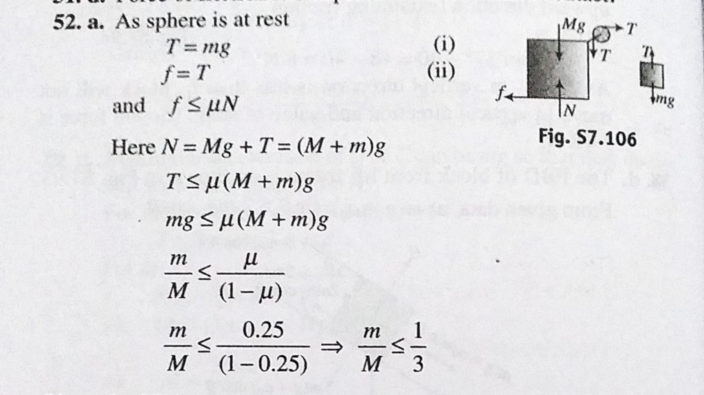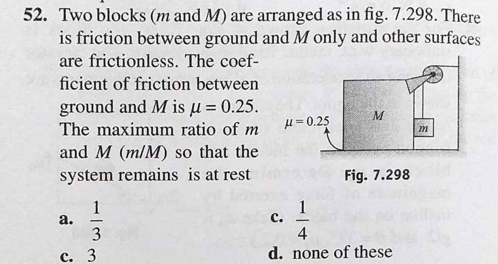 Two blocks ( m and M ) are arranged as in fig. 7.298. There is friction between ground and M only and other surfaces are frictionless. The coefficient of friction between ground and M is mu = 0.25. Two blocks ( m and M ) are arranged as in fig. 7.298. There is friction between ground and M only and other surfaces are frictionless. The coefficient of friction between ground and M is mu = 0.25. October 1, 2020 Category: Uncategorised (JEE Advanced Physics by BM Sharma + GMP Solutions) , Facebook Messenger WhatsApp Share this:TwitterFacebook Related