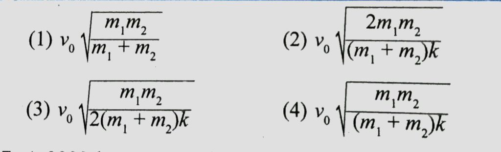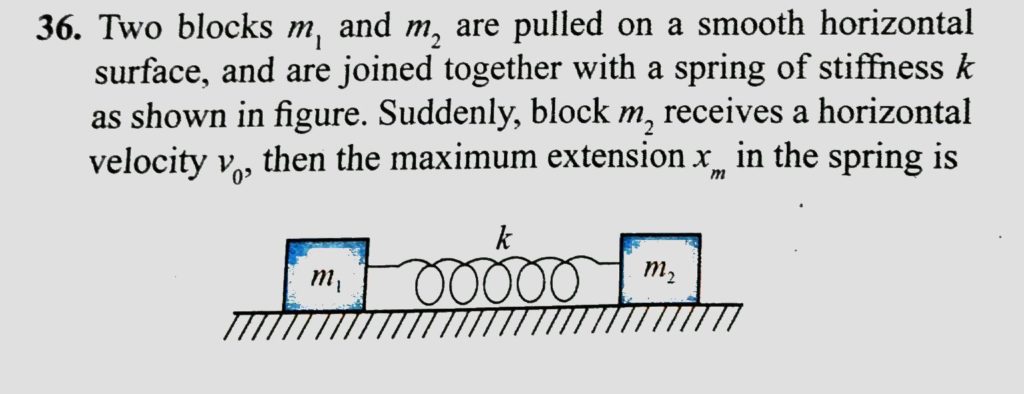 Two blocks m1 and m2 are pulled on a smooth horizontal surface, and are joined together with a spring of stiffness k as shown in Fig. Suddenly, block m2 receives a horizontal velocity v0, then the maximum extension xm in the spring is and are joined together with a spring of stiffness k as shown in Fig. Suddenly block m2 receives a horizontal velocity v0 then the maximum extension xm in the spring is Two blocks m1 and m2 are pulled on a smooth horizontal surface September 21, 2020 Category: Uncategorised (JEE Advanced Physics by BM Sharma + GMP Solutions) , Facebook Messenger WhatsApp Share this:TwitterFacebook Related