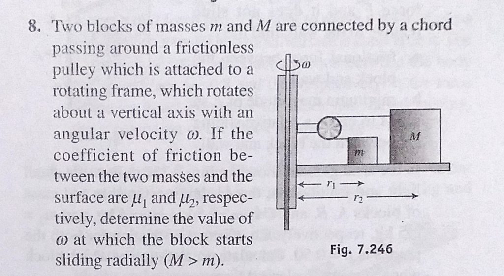 Two blocks of masses m and M are connected by a chord passing around a frictionless pulley which is attached to a rotating frame, which rotates about a vertical axis with an angular velocity omega. Two blocks of masses m and M are connected by a chord passing around a frictionless pulley which is attached to a rotating frame which rotates about a vertical axis with an angular velocity omega. September 30, 2020 Category: Uncategorised (JEE Advanced Physics by BM Sharma + GMP Solutions) , Facebook Messenger WhatsApp Share this:TwitterFacebook Related