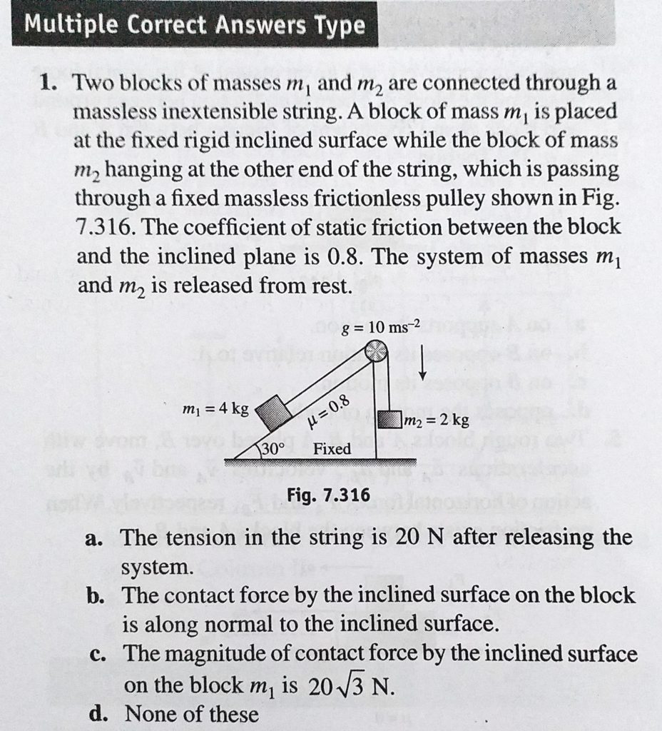 Two blocks of masses m1 and m2 are connected through a massless inextensible string. A block of mass m1 is placed at the fixed rigid inclined surface while the block of mass m2 hanging at the other end A car travels with constant speed on a circular road on level ground. In Fig. 7.312 Fair is the force of air resistance acts opposite to the motion of car. Which of the other forces shown best October 1, 2020 Category: Uncategorised (JEE Advanced Physics by BM Sharma + GMP Solutions) , Facebook Messenger WhatsApp Share this:TwitterFacebook Related