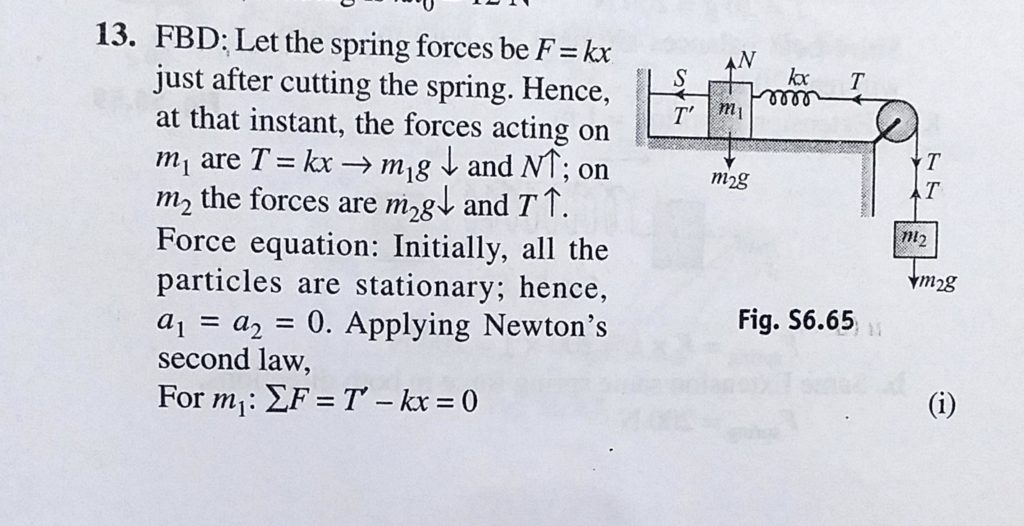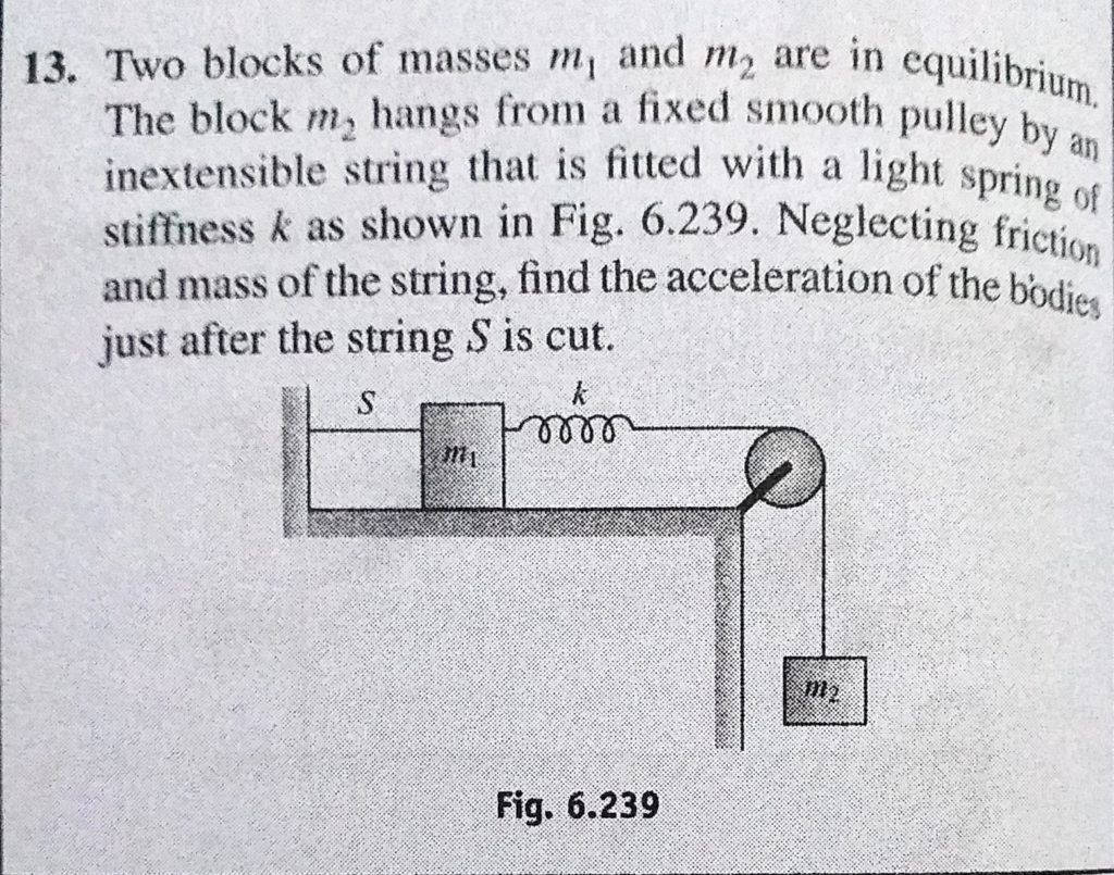 Two blocks of masses m1 and m2 are in equilibrium. The block m2 hangs from a fixed smooth pulley by an inextensible string that is fitted with a light spring of stiffness k as shown in Fig.6.239. Two blocks of masses m1 and m2 are in equilibrium. The block m2 hangs from a fixed smooth pulley by an inextensible string that is fitted with a light spring of stiffness k as shown in Fig.6.239. September 29, 2020 Category: Uncategorised (JEE Advanced Physics by BM Sharma + GMP Solutions) , Facebook Messenger WhatsApp Share this:TwitterFacebook Related
