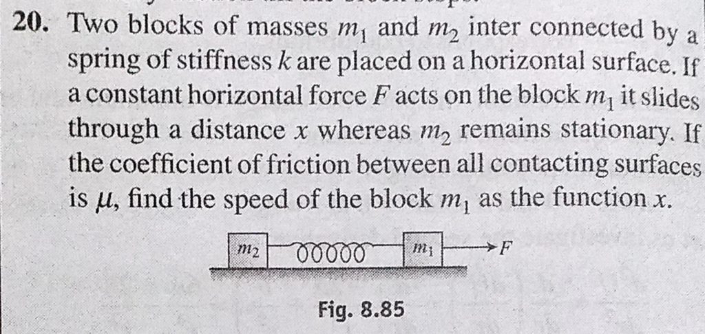 Two blocks of masses m1 and m2 inter connected by a spring of stiffness k are placed on a horizontal surface. If a constant horizontal force F acts on the block m1 it slided through a distance x Two blocks of masses m1 and m2 inter connected by a spring of stiffness k are placed on a horizontal surface. If a constant horizontal force F acts on the block m1 it slided through a distance x October 2, 2020 Category: Uncategorised (JEE Advanced Physics by BM Sharma + GMP Solutions) , Facebook Messenger WhatsApp Share this:TwitterFacebook Related