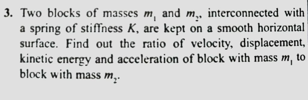 Two blocks of masses `m_(1)` and `m_(2)` interconnect with a spring of stiffness `K`, are kept on as smooth horizontal surface. Find out the ratio of velocity, displacement, kinetic energy and acceleration block with mass `m_(1)` of block with mass `m_(2)`.