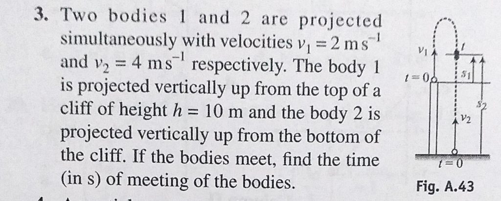 Two bodies 1 and 2 are projected simultaneously with velocities v1 = 2 m/s and v2 = 4 m/s respectively. The body 1 is projected vertically up from the top of a cliff of height h = 10 m Two bodies 1 and 2 are projected simultaneously with velocities v1 = 2 m/s and v2 = 4 m/s respectively. The body 1 is projected vertically up from the top of a cliff of height h = 10 m September 25, 2020 Category: Uncategorised (JEE Advanced Physics by BM Sharma + GMP Solutions) , Facebook Messenger WhatsApp Share this:TwitterFacebook Related