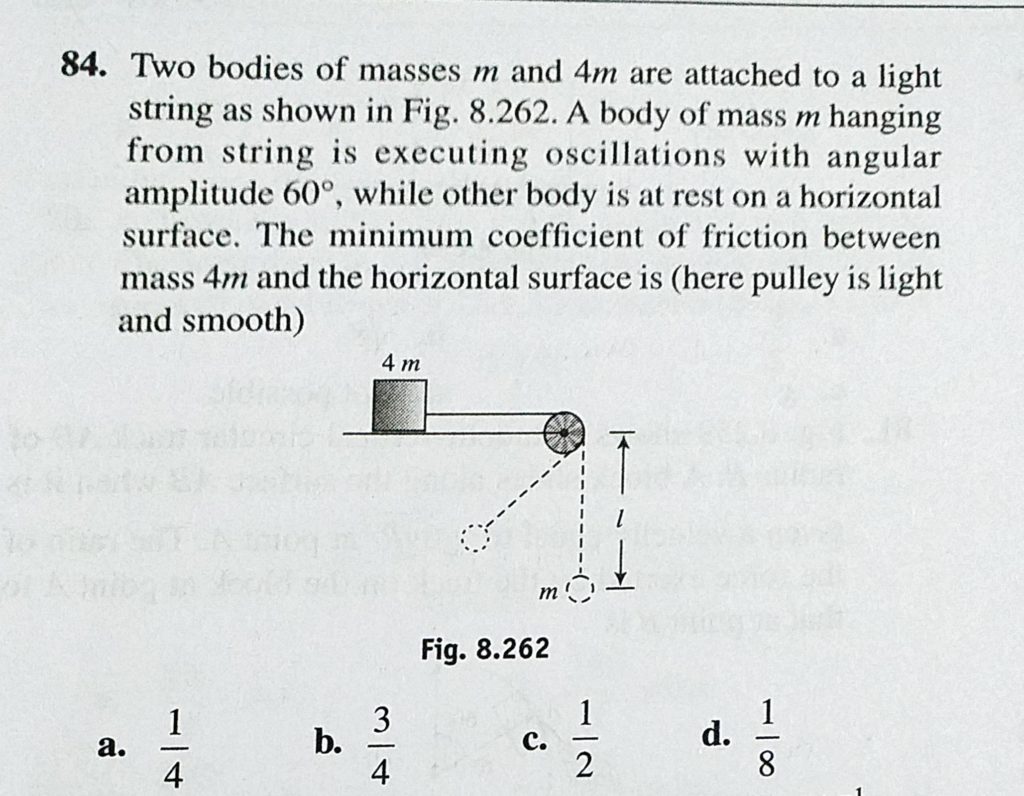 Two bodies of masses m and 4 m are attached to a light string as shown in Fig. 8.262. A body of mass m hanging from string is executing oscillations with angular amplitude 60, while other body Two bodies of masses m and 4 m are attached to a light string as shown in Fig. 8.262. A body of mass m hanging from string is executing oscillations with angular amplitude 60 while other body October 4, 2020 Category: Uncategorised (JEE Advanced Physics by BM Sharma + GMP Solutions) , Facebook Messenger WhatsApp Share this:TwitterFacebook Related