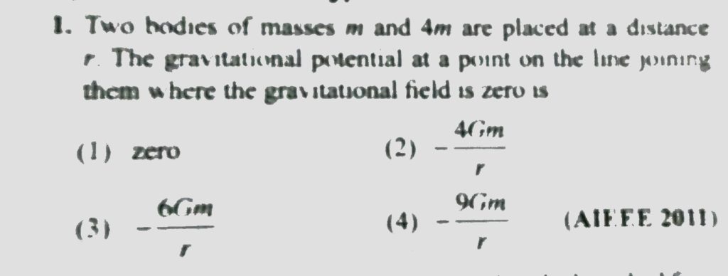 Two bodies of masses m and 4 m are placed at a distance r. The gravitational potential at a point on the line joining them where the gravitational field is zeo is Two bodies of masses m and 4 m are placed at a distance r. The gravitational potential at a point on the line joining them where the gravitational field is zeo is October 6, 2020 Category: Uncategorised (JEE Advanced Physics by BM Sharma + GMP Solutions) , Facebook Messenger WhatsApp Share this:TwitterFacebook Related
