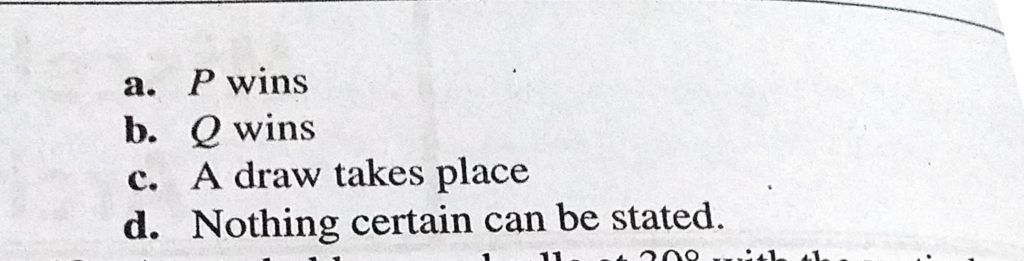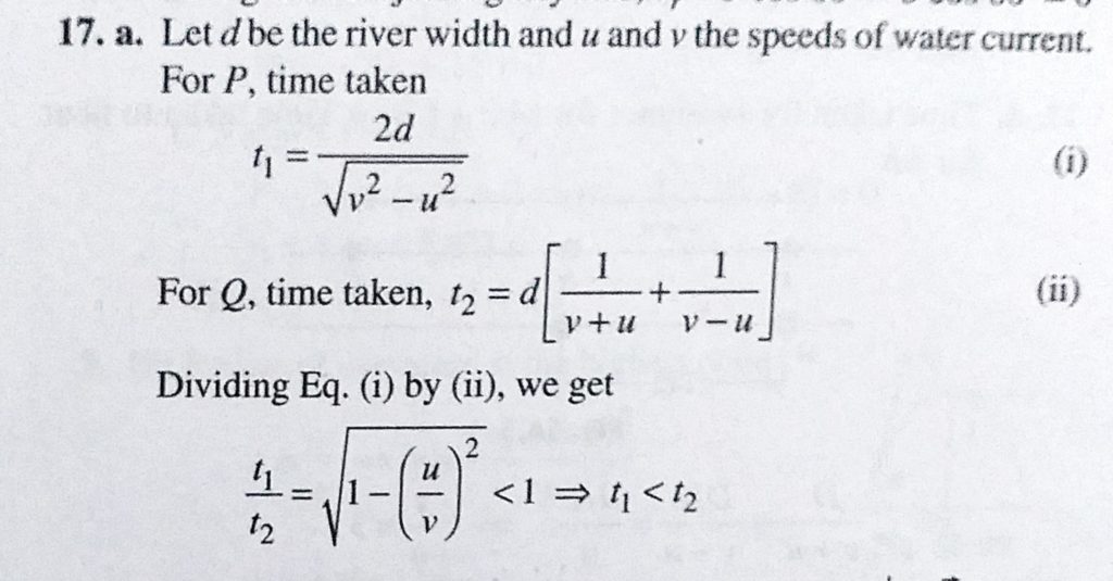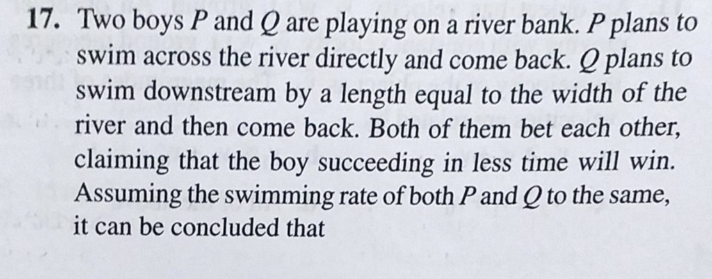Two boys P and Q are playing on a river bank. P plans to swim across the river directly and come back. Q plans to swim downstream by a length equal to the width of the river and then come back. Both of them bet each other, A man swimming downstream overcomes a float at a point M. After travelling distance D he turned back and passed the float at a distance of D/2 from the point M. Then the ratio of speed of swimmer with respect to still water to September 24, 2020 Category: Uncategorised (JEE Advanced Physics by BM Sharma + GMP Solutions) , Facebook Messenger WhatsApp Share this:TwitterFacebook Related