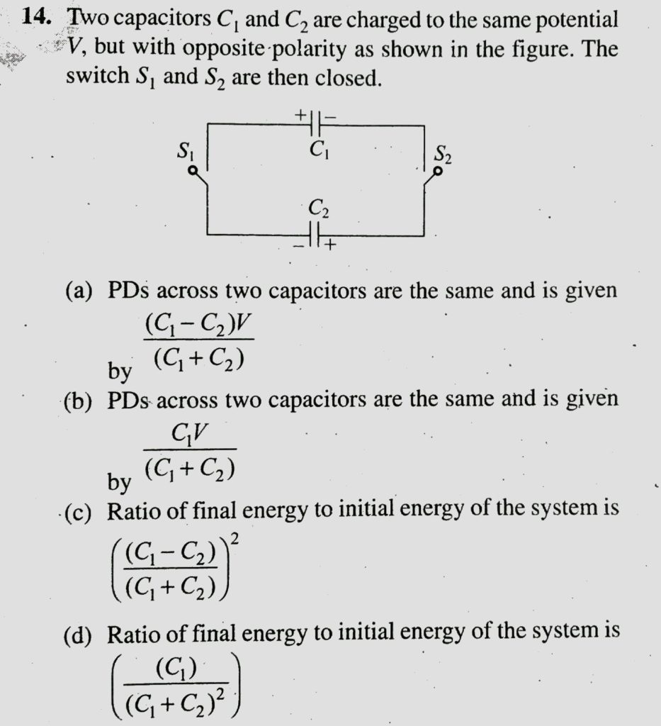 Two capacitors c1 and c2 are charged to the same potential V, but with opposite polarity as shown in the figure. The switch s1 and s2 are then closed. but with opposite polarity as shown in the figure. The switch s1 and s2 are then closed. Two capacitors c1 and c2 are charged to the same potential V September 19, 2020 Category: Uncategorised (JEE Advanced Physics by BM Sharma + GMP Solutions) , Facebook Messenger WhatsApp Share this:TwitterFacebook Related