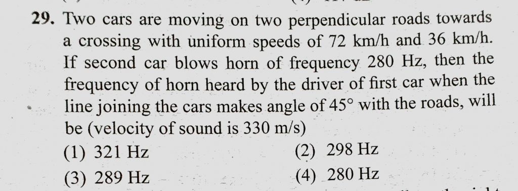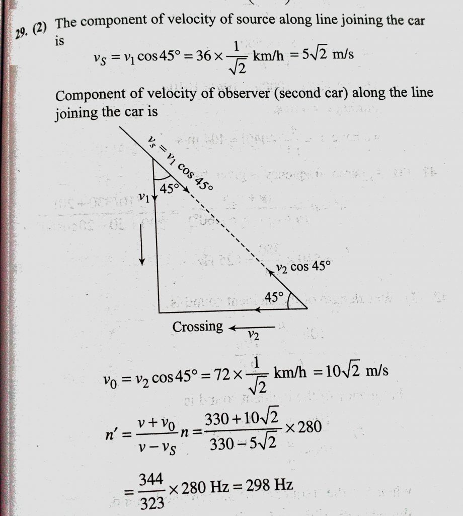 Two cars are moving on two perpendicular roads towards a crossing with uniform speeds of 72 km/h and 36 km/h. If second car blows horn of frequency 280 Hz, then the frequency then the frequency Two cars are moving on two perpendicular roads towards a crossing with uniform speeds of 72 km/h and 36 km/h. If second car blows horn of frequency 280 Hz November 7, 2020 Category: Uncategorised (JEE Advanced Physics by BM Sharma + GMP Solutions) , Facebook Messenger WhatsApp Share this:TwitterFacebook Related