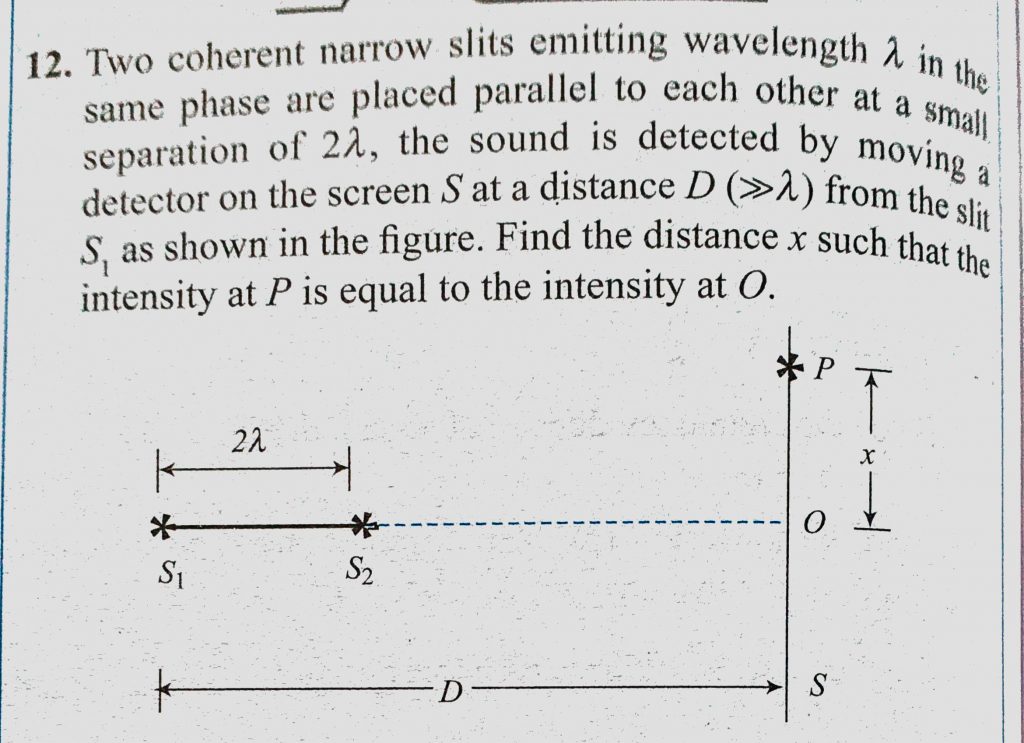 Two coherent narrow slits emitting wavelength lemda in the same phase are placed parallel to each other at a small separation of 2 lemda, the sound is detected by moving a detector the sound is detected by moving a detector Two coherent narrow slits emitting wavelength lemda in the same phase are placed parallel to each other at a small separation of 2 lemda November 5, 2020 Category: Uncategorised (JEE Advanced Physics by BM Sharma + GMP Solutions) , Facebook Messenger WhatsApp Share this:TwitterFacebook Related
