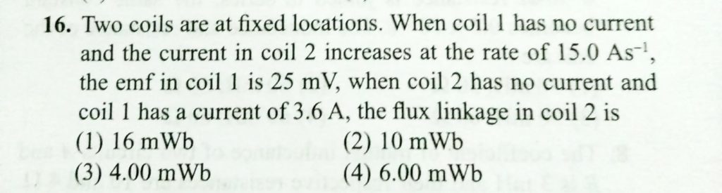 Two coils are at fixed location: When coil 1 has no correct and the current in coil 2 increase at the rate of 15.0 A/s, the emf in coil 1 is 25mV, when coil 2 has no current and coil 1 has a current of 3.6 A, the flux linkange in coil 2 is the emf in coil 1 is 25mV the flux linkange in coil 2 is Two coils are at fixed location: When coil 1 has no correct and the current in coil 2 increase at the rate of 15.0 A/s when coil 2 has no current and coil 1 has a current of 3.6 A October 22, 2020 Category: Uncategorised (JEE Advanced Physics by BM Sharma + GMP Solutions) , Facebook Messenger WhatsApp Share this:TwitterFacebook Related