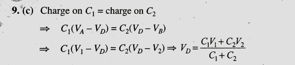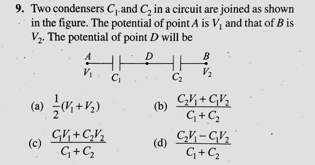 Two condensers c1 and c2 in a circuit are joined as shown in the figure. The potential of point A is V1 and that of B is V2 . The potential of point D will be Two condensers c1 and c2 in a circuit are joined as shown in the figure. The potential of point A is V1 and that of B is V2 . The potential of point D will be September 19, 2020 Category: Uncategorised (JEE Advanced Physics by BM Sharma + GMP Solutions) , Facebook Messenger WhatsApp Share this:TwitterFacebook Related