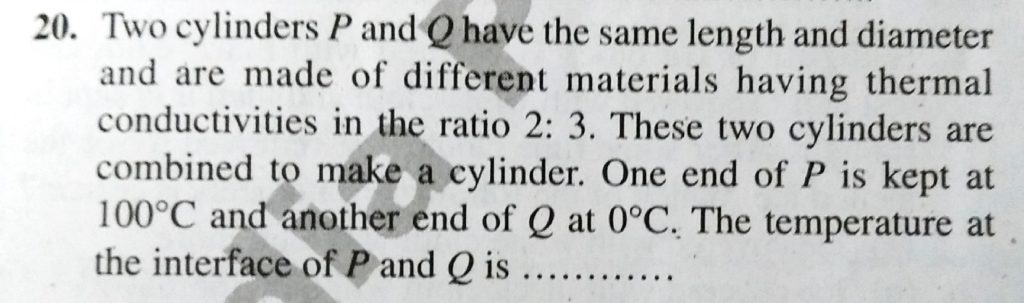 Two cylinders P and Q have the same length and diameter and are made of different materials having thermal conductivities in the ratio 2 : 3. These two cylinders are combined to make a cylinder. One end of P is kept at 100°C and another end of Q at 0°C . The temperature at the interface of P and Q is