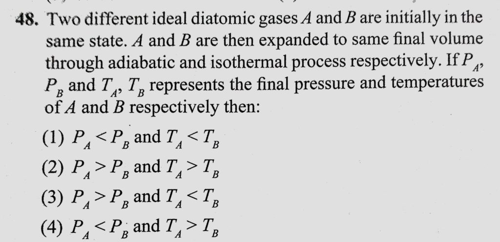 Two different ideal diatomic gases A and B are initially in the same state. A and B are then expanded to same final volume through adiabatic and isothermal process respectively. Two different ideal diatomic gases A and B are initially in the same state. A and B are then expanded to same final volume through adiabatic and isothermal process respectively. October 29, 2020 Category: Uncategorised (JEE Advanced Physics by BM Sharma + GMP Solutions) , Facebook Messenger WhatsApp Share this:TwitterFacebook Related