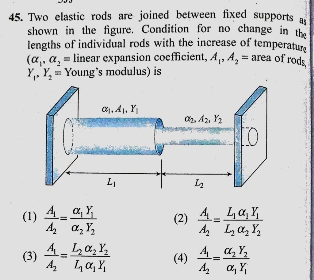 Two elastic rods are joined between fixed supports as shown in the figure. Condition for no change in the length of individual rods with the increase of temperature (alpha 1, alpha 2 = linear expansion coefficient, alpha 2 = linear expansion coefficient Two elastic rods are joined between fixed supports as shown in the figure. Condition for no change in the length of individual rods with the increase of temperature (alpha 1 October 23, 2020 Category: Uncategorised (JEE Advanced Physics by BM Sharma + GMP Solutions) , Facebook Messenger WhatsApp Share this:TwitterFacebook Related