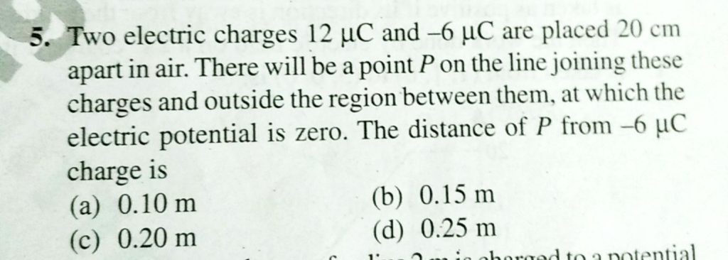 Two electric charges 12 muC and -6 muC are placed 20 cm apart in air. There will be a point P on the line joining these charges and outside the region between them, at which the electric potential is zero. The distance of P from -6 muC charge is at which the electric potential is zero. The distance of P from -6 muC charge is Two electric charges 12 muC and -6 muC are placed 20 cm apart in air. There will be a point P on the line joining these charges and outside the region between them September 17, 2020 Category: Uncategorised (JEE Advanced Physics by BM Sharma + GMP Solutions) , Facebook Messenger WhatsApp Share this:TwitterFacebook Related