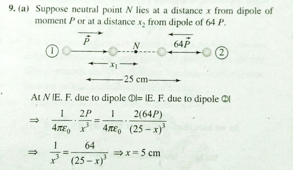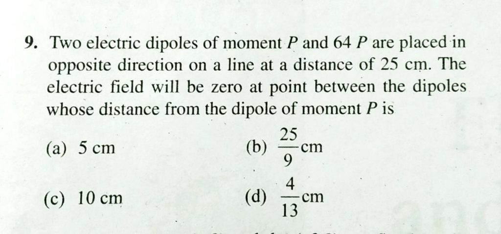 Two electric dipoles of moment P and 64 P are placed in opposite direction on a line at a distance of 25 cm. The electric field be zero zt point between the dipoles whose distance from the dipole of moment P is Three identical dipoles are arranged as shown in the figure. what will be the net electric field at p { K = 1 / 4 pie e0 } ? September 17, 2020 Category: Uncategorised (JEE Advanced Physics by BM Sharma + GMP Solutions) , Facebook Messenger WhatsApp Share this:TwitterFacebook Related
