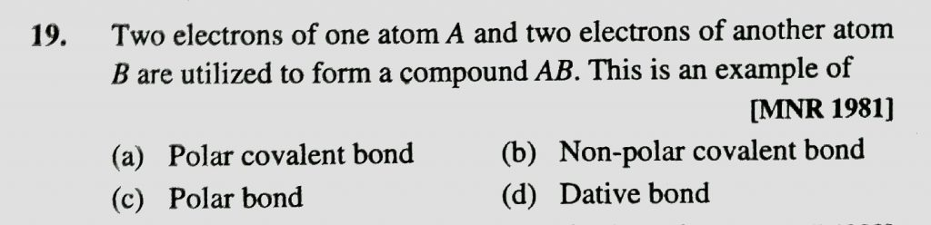 Two electrons of one atom A and two electrons of another atom B are utilized to form a compound AB. This is an example of Two electrons of one atom A and two electrons of another atom B are utilized to form a compound AB. This is an example of December 2, 2020 Category: Uncategorised (JEE Advanced Physics by BM Sharma + GMP Solutions) , Facebook Messenger WhatsApp Share this:TwitterFacebook Related