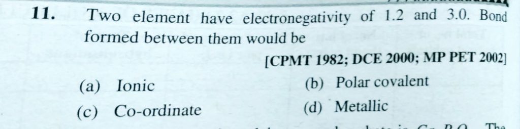 Two element have electronegativity of 1.2 and 3.0. Bond formed between them would be Two element have electronegativity of 1.2 and 3.0. Bond formed between them would be December 1, 2020 Category: Uncategorised (JEE Advanced Physics by BM Sharma + GMP Solutions) , Facebook Messenger WhatsApp Share this:TwitterFacebook Related