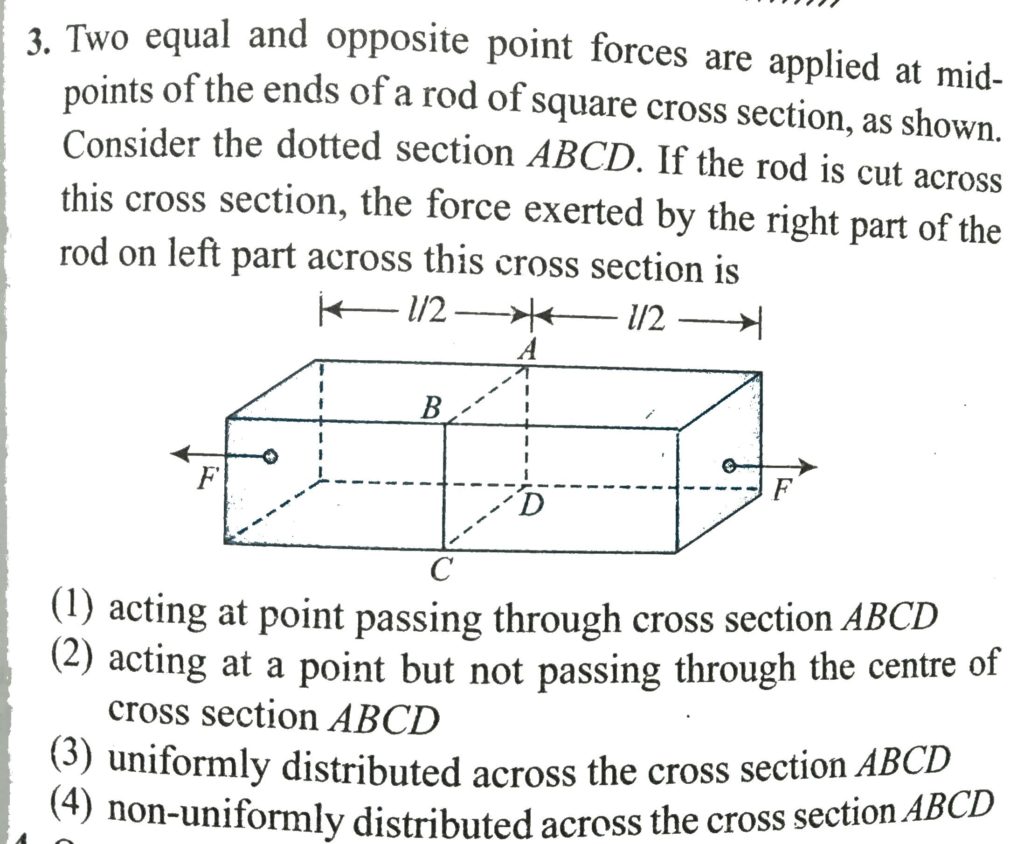 Two equal and opposite point forces applied at mid- points of the ends of a rod of square cross shown. Consider the dotted section ABCD. If the rod is cut across this Gloss section, the force exerted by the right part of the rod on left part across this cross section is