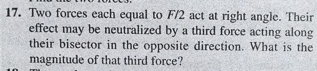 Two forces each equal to F/2 act at right angle. Their effect may be neutralized by a third force acting along their bisector in the opposite direction. What is the magnitude of that Two forces each equal to F/2 act at right angle. Their effect may be neutralized by a third force acting along their bisector in the opposite direction. What is the magnitude of that September 16, 2020 Category: Uncategorised (JEE Advanced Physics by BM Sharma + GMP Solutions) , Facebook Messenger WhatsApp Share this:TwitterFacebook Related