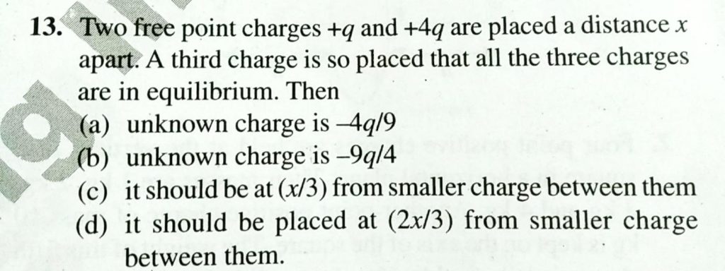 Two free point charges +q and +4q are placed a distance x apart. A third charge is so placed that all the three charges are in equilibrium. Then Two free point charges +q and +4q are placed a distance x apart. A third charge is so placed that all the three charges are in equilibrium. Then September 15, 2020 Category: Uncategorised (JEE Advanced Physics by BM Sharma + GMP Solutions) , Facebook Messenger WhatsApp Share this:TwitterFacebook Related
