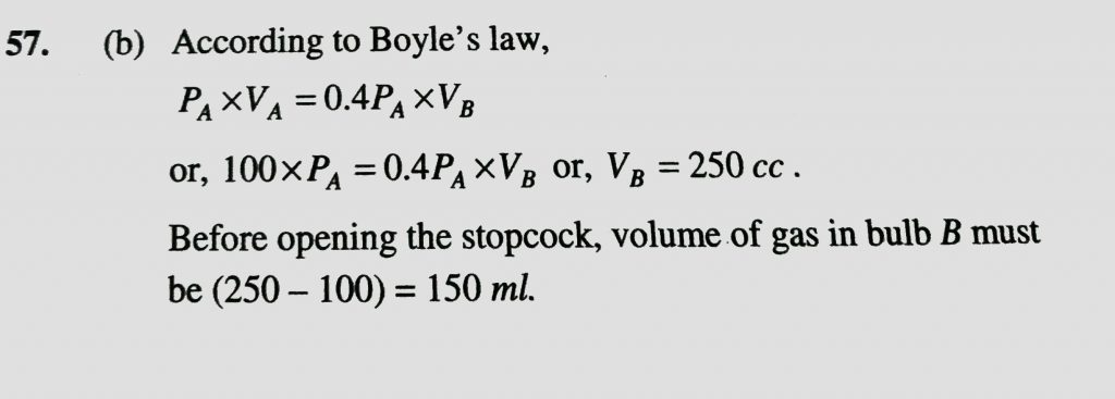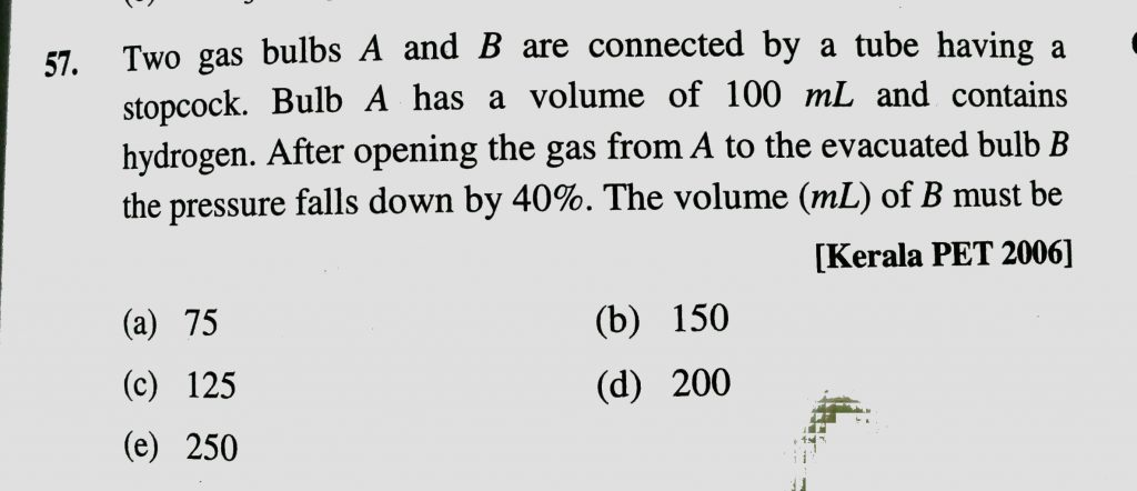 Two gas bulbs A and B are connected by a tube having a stopcock. Bulb A has volume of 100 mL and contains hydrogen. After opening the gas from A to the evacuated bulb B, the pressure falls down by 40%. The volume (mL) of B must be: the pressure falls down by 40%. The volume (mL) of B must be: Two gas bulbs A and B are connected by a tube having a stopcock. Bulb A has volume of 100 mL and contains hydrogen. After opening the gas from A to the evacuated bulb B February 10, 2021 Category: Uncategorised (JEE Advanced Physics by BM Sharma + GMP Solutions) , Facebook Messenger WhatsApp Share this:TwitterFacebook Related