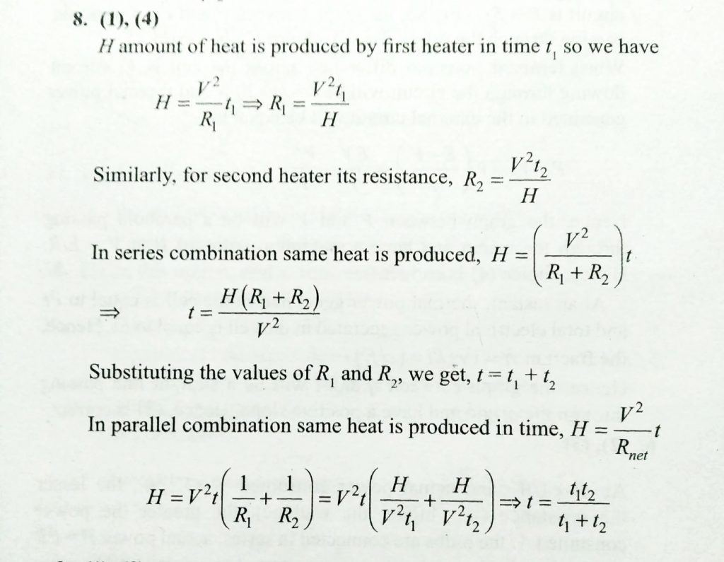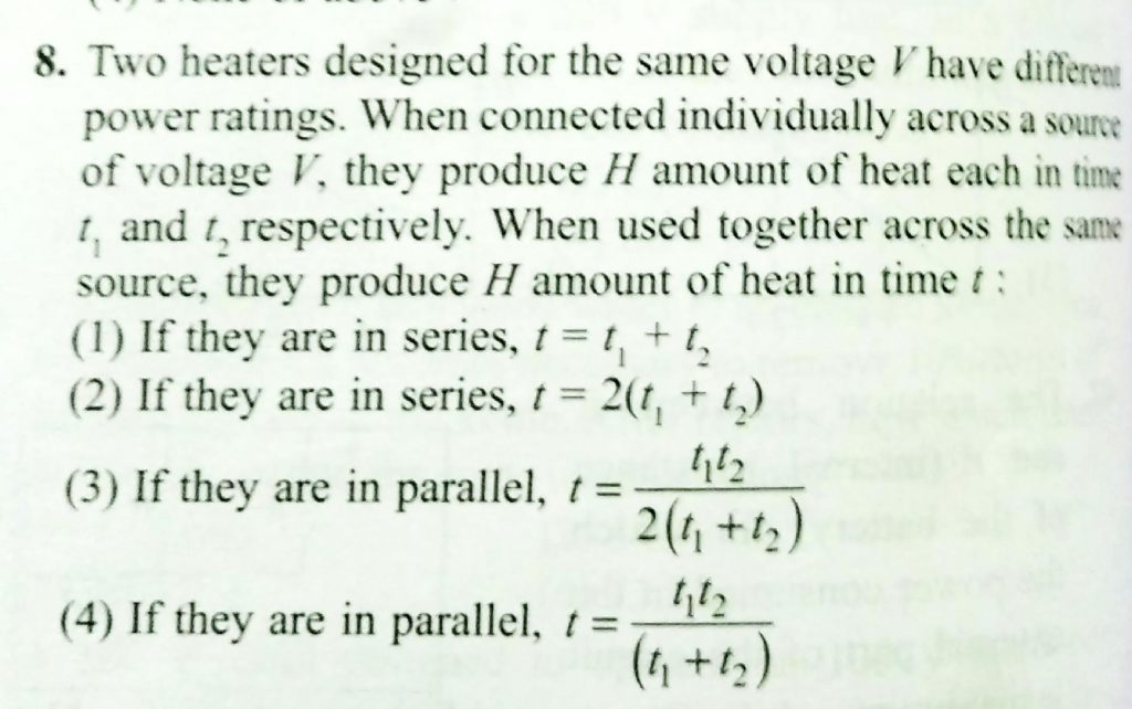 Two heaters designed for the same voltage V have different power ratings. When connected individually across as source of voltageV, they produce H amount of heat each in time t1 and t2 respectively. When used together acros the same source, they produce H amount of heat in time t
