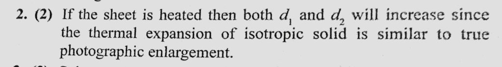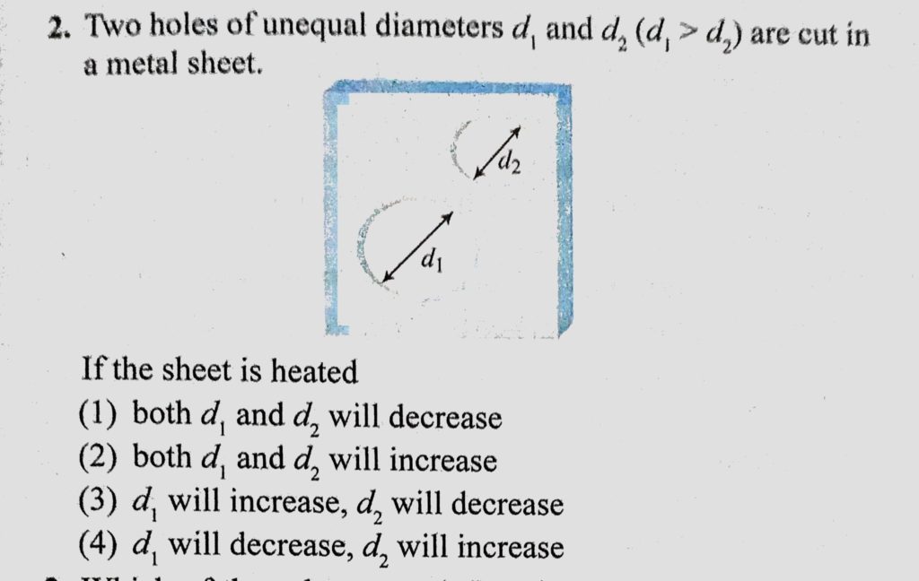Two holes of unequal diameters d1 and d2 (d1 > d2) are cut in a metal sheet. If the sheet is heated (1) both d1 and d2 will decrease (2) both d1 and d2 will increase Two holes of unequal diameters d1 and d2 (d1 > d2) are cut in a metal sheet. If the sheet is heated (1) both d1 and d2 will decrease (2) both d1 and d2 will increase October 23, 2020 Category: Uncategorised (JEE Advanced Physics by BM Sharma + GMP Solutions) , Facebook Messenger WhatsApp Share this:TwitterFacebook Related