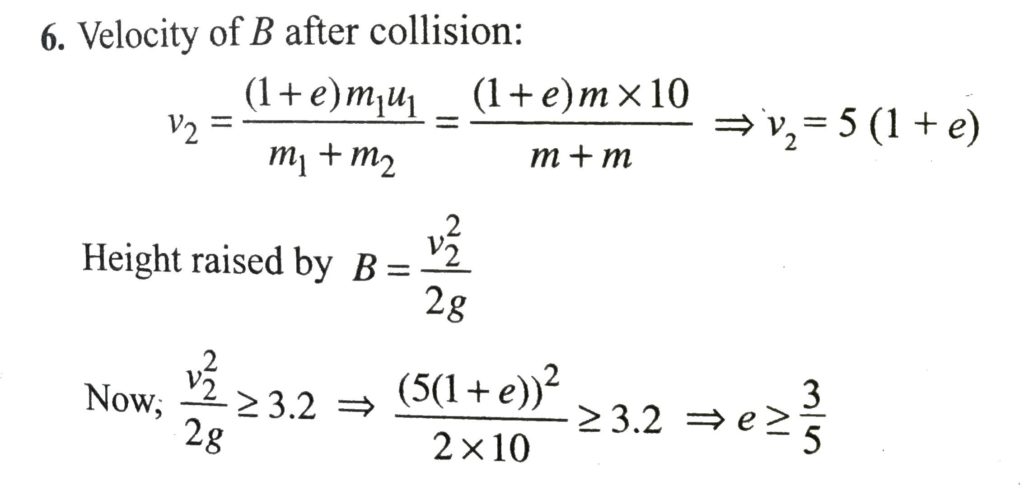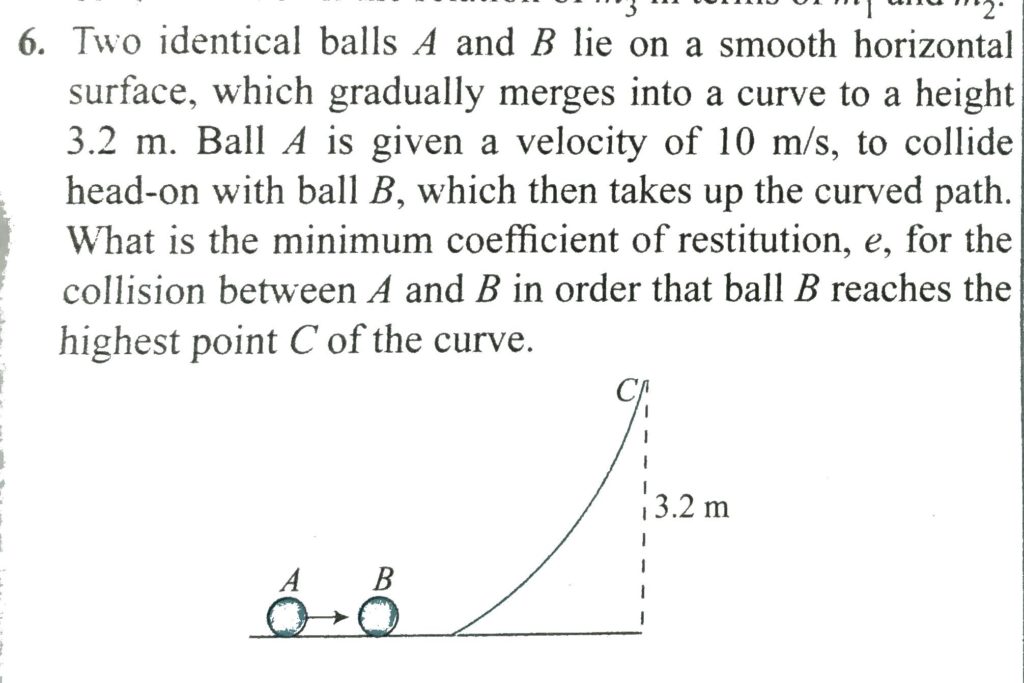 Two identical balls A and B lie on a smooth horizontal surface, which gradually merges into a curve to a height 3.2m. Ball A is given a velocity of 10m/s, to collide head-on with ball B, which then takes up the curved path. What is the minimum coefficient of restitution, e, for the collision between A and B in order that ball B reaches the highest point C of the curve.