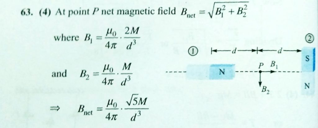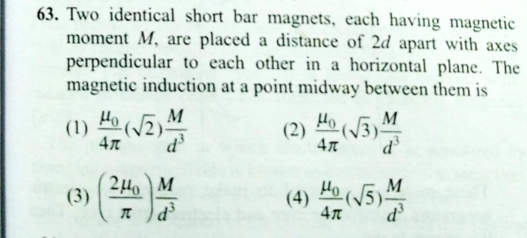 Two identical bar magnets each having magnetic moment of M, are kept at a distance of 2d with their axes perpendicular to each other in a horizontal plane. The magnetic induction midway between them is : are kept at a distance of 2d with their axes perpendicular to each other in a horizontal plane. The magnetic induction midway between them is : Two identical bar magnets each having magnetic moment of M October 18, 2020 Category: Uncategorised (JEE Advanced Physics by BM Sharma + GMP Solutions) , Facebook Messenger WhatsApp Share this:TwitterFacebook Related
