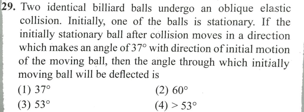 Two identical billiard balls undergo an oblique elastic collision. Initially, one of the balls is stationary. If the initially stationary ball after collision moves in a direction which makes an angle of 37∘ with direction of initial motion of the moving ball, then the angle through which initially moving ball will be deflected is
