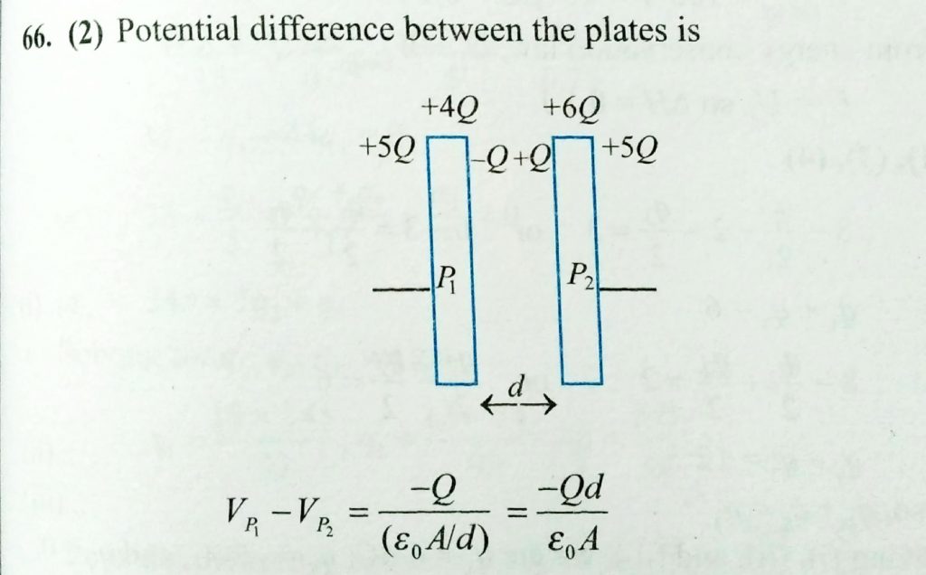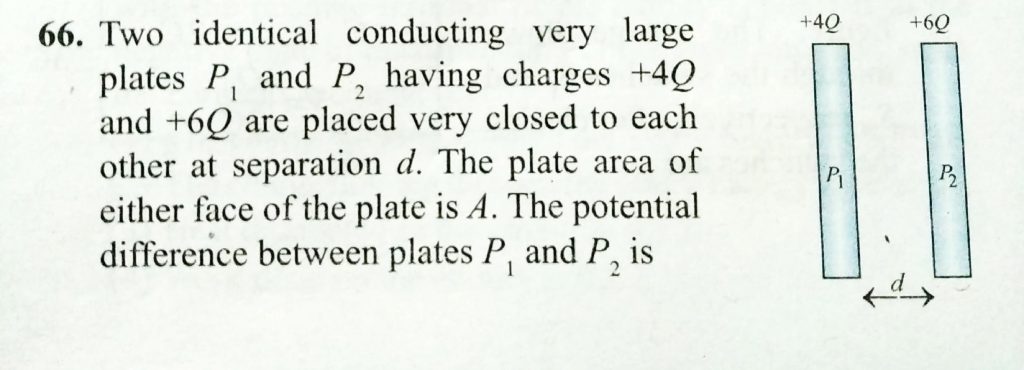 Two identical conducting very large plates p1 and p2 having charges +4Q and +6Q are placed very closed to each other at seperation d. The plate area of either face of the plate is A . The potential difference between plates P1 and P2 is are placed parallel to each other at a distance d. One plate is connected to a battery of emf E and its negative is earthed. The other plate is also earthed. The charge drawn by plate is each of area A Two plates November 8, 2020 Category: Uncategorised (JEE Advanced Physics by BM Sharma + GMP Solutions) , Facebook Messenger WhatsApp Share this:TwitterFacebook Related