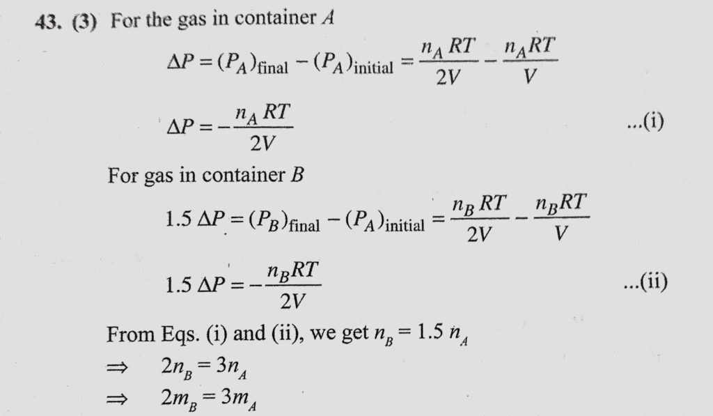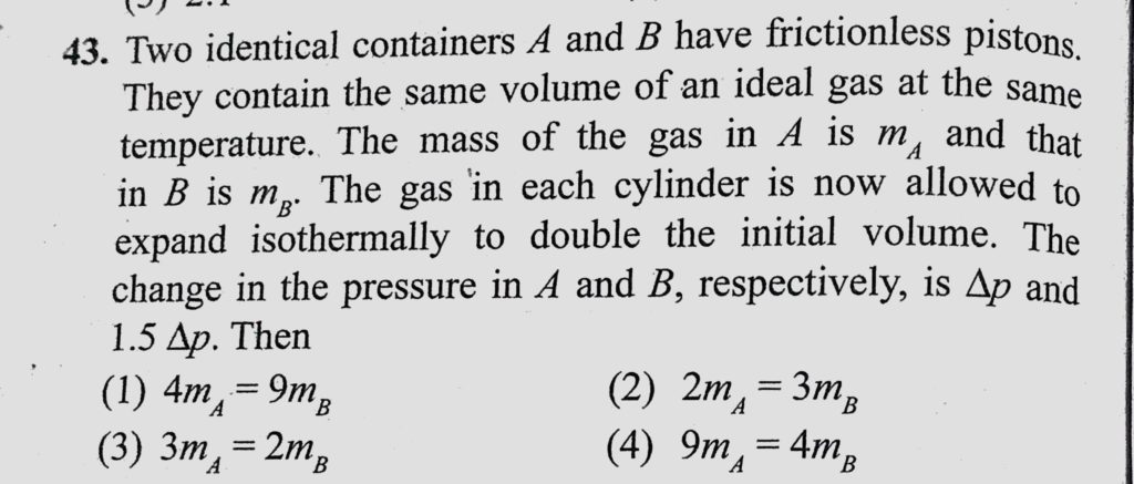 Two identical containers A and B have frictionless pistons. They contain the same volume of an ideal gas at the same temperature. The mass of the gas in A is mA and that in B is mB. Two identical containers A and B have frictionless pistons. They contain the same volume of an ideal gas at the same temperature. The mass of the gas in A is mA and that in B is mB. October 27, 2020 Category: Uncategorised (JEE Advanced Physics by BM Sharma + GMP Solutions) , Facebook Messenger WhatsApp Share this:TwitterFacebook Related