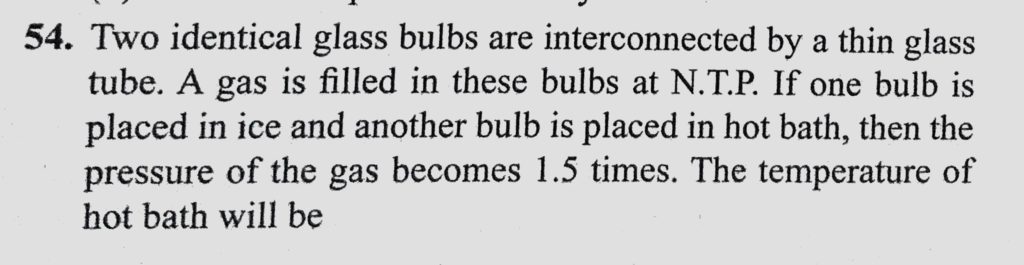 Two identical glass bulbs are interconnected by a thin glass tube. A gas is filled in these bulbs at N.T.P. If one bulb is placed in ice and another bulb is placed in hot bath, then the pressure of then the pressure of Two identical glass bulbs are interconnected by a thin glass tube. A gas is filled in these bulbs at N.T.P. If one bulb is placed in ice and another bulb is placed in hot bath October 27, 2020 Category: Uncategorised (JEE Advanced Physics by BM Sharma + GMP Solutions) , Facebook Messenger WhatsApp Share this:TwitterFacebook Related
